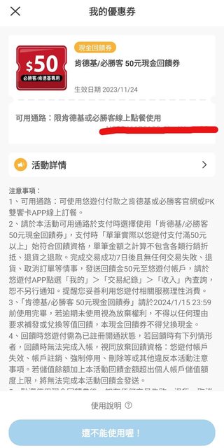推 live4132: 50是優惠券,只能用在肯德基或必勝客 114.32.76.146 11/17 21:31