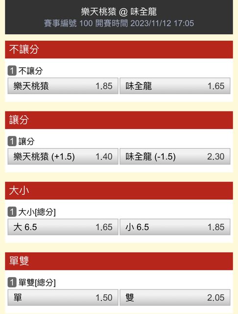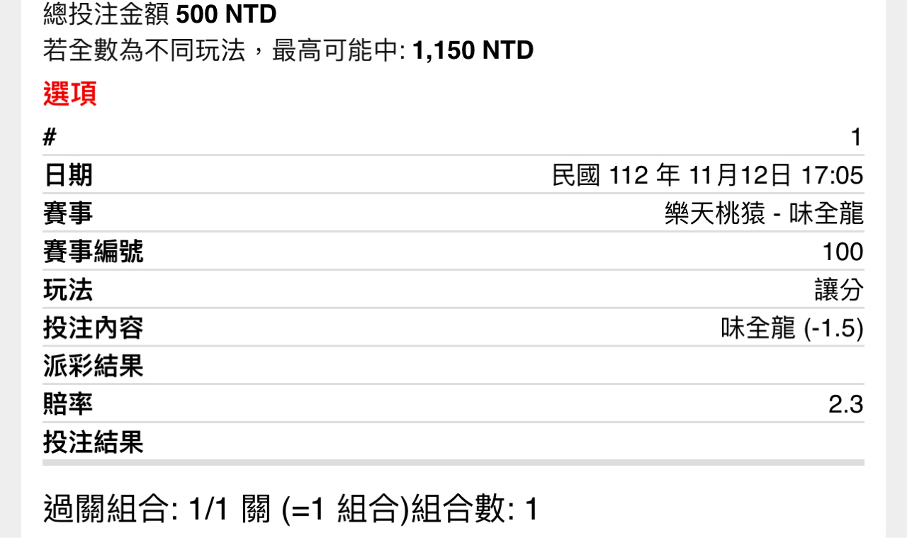 一 二 三 四 五 六 七 八 九 T 樂天 1 2 0 0 0 0 0 0 0 3 味全 5 0 0 0 0 0 0 1 X 6 -- ※ 發信站: 批踢踢實業坊(pttbestweb.org.tw), 來自: 1.173.50.96 (臺灣) ※ 文章網址: https://pttbestweb.org.tw/SportLottery/M.1699778102.A.E75