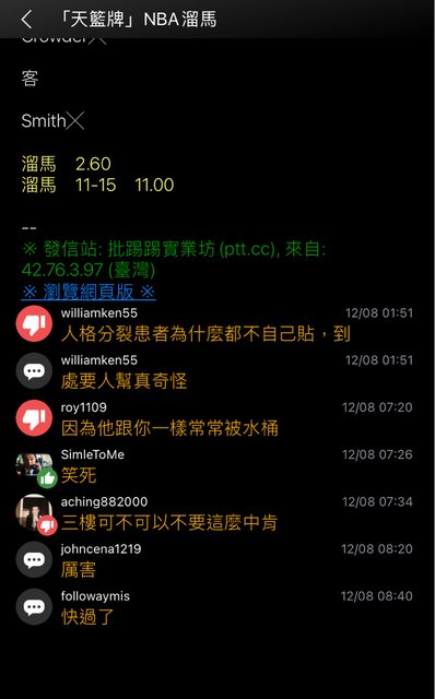 → yugowolf: 2222 這類推文 他也看人家不爽去檢舉 114.35.15.94 12/11 07:44