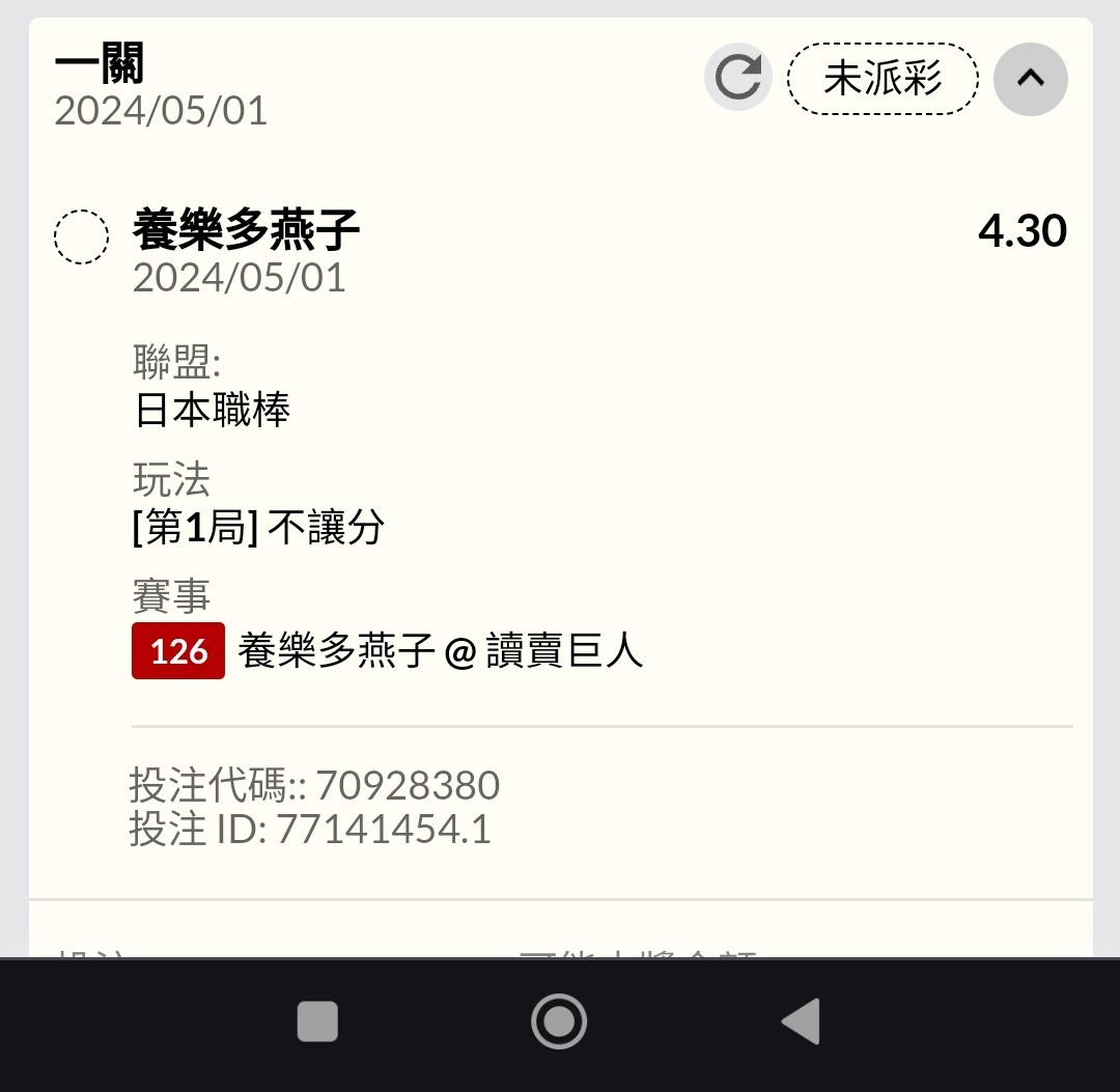 最近下一整天雨 有點煩啊 買中日場4.5大分 串 軟銀場6.5大分 串 歐牛PK 祝各位朋友關關過 加油 ----- Sent from JPTT on my LGE LM-G900. -- ※ 發信站: 批踢踢實業坊(pttbestweb.org.tw), 來自: 219.68.158.203 (臺灣) ※ 文章網址: https://pttbestweb.org.tw/SportLottery/M.1714554053.A.171