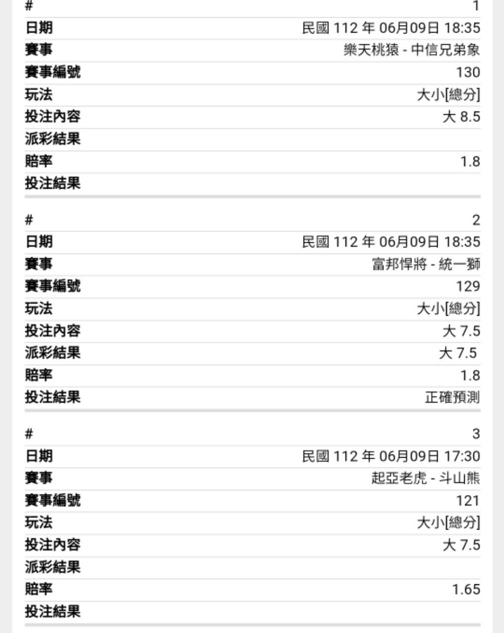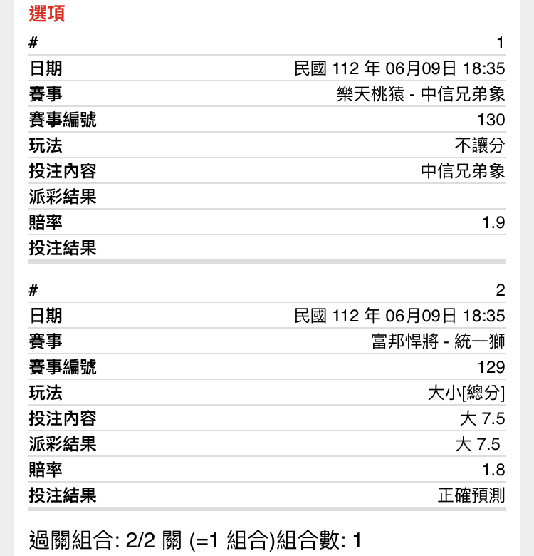統一(-1.5)8 富邦(+1.5)0 大小分(7.5) 兄弟(+1.5)6 樂天(-1.5)5 大小分(8.5) -- ※ 發信站: 批踢踢實業坊(pttbestweb.org.tw), 來自: 101.9.65.60 (臺灣) ※ 文章網址: https://pttbestweb.org.tw/SportLottery/M.1686305572.A.835