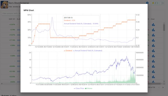 可以看到最前面的殖利率異常高, 我是覺得應該是比較早期的股息資料有些沒有調整好,