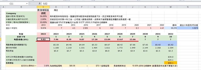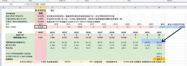 得出長虹過去十年股利平均值=5.92
