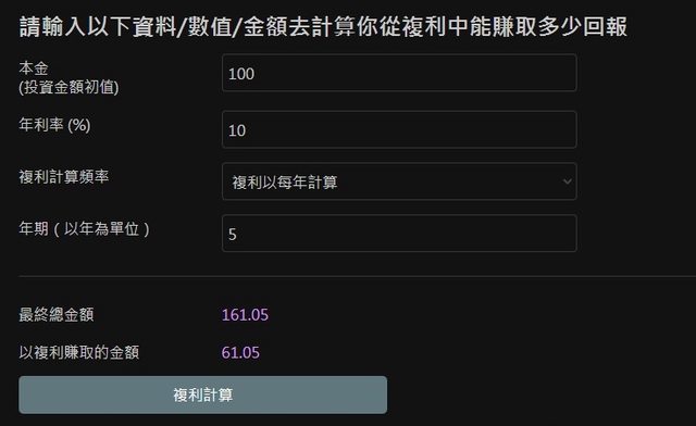 5年後複利計算賺取的報酬是60%上下