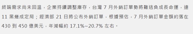 經濟部原本預估,7月外銷訂單約430億美元至450億美元之間,年減幅二成左右,但最終