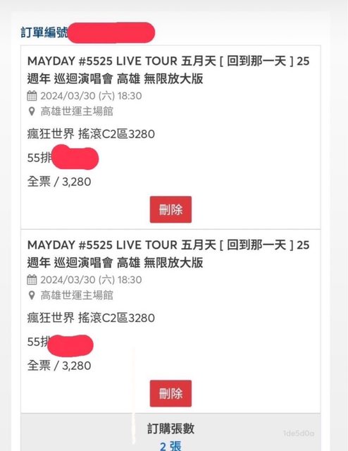 轉讓項目:五月天3/30 高雄 18:30 搖滾C2區 第55排 連號
