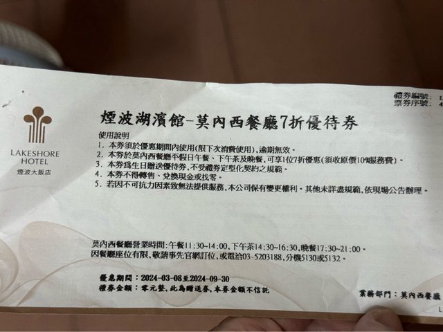 3.煙波西餐廳優待券(有期限)