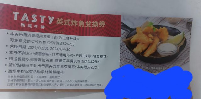 物品名稱:英式炸魚兌換券1張,期限到4/30