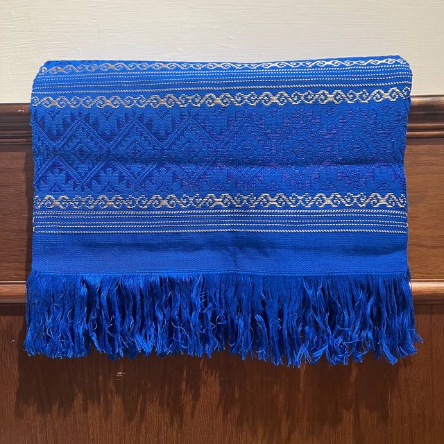 藍色手工紡織桌巾搭配藍色金色圖騰,低調奢華,亦可裝飾床鋪或當裝飾掛起來。