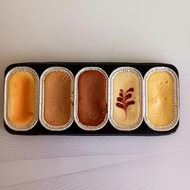 1.一盒裡面有五種口味小蛋糕,分別是原味、芒果、藍莓、巧克力、咖啡,每個約35g。