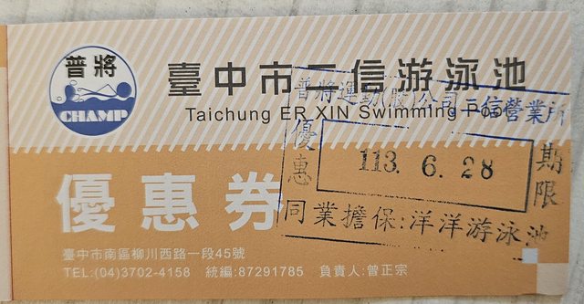 物品:台中二信游泳池門票