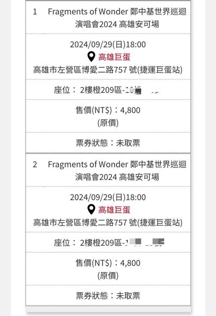 標題[交易] 售 鄭中基9/29演唱會連號門票