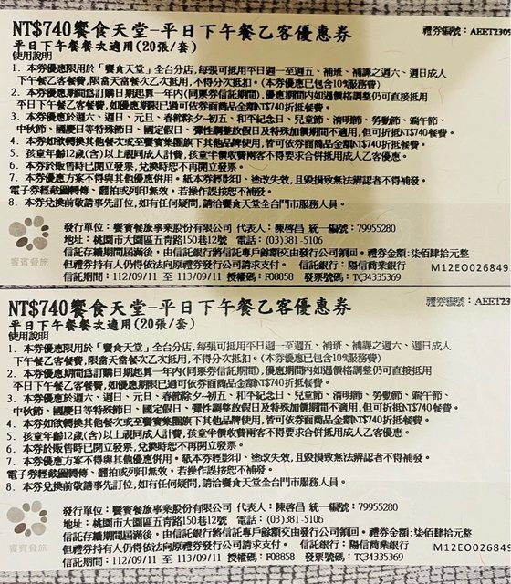 販售物品:響食天堂平日下午茶餐券X2
