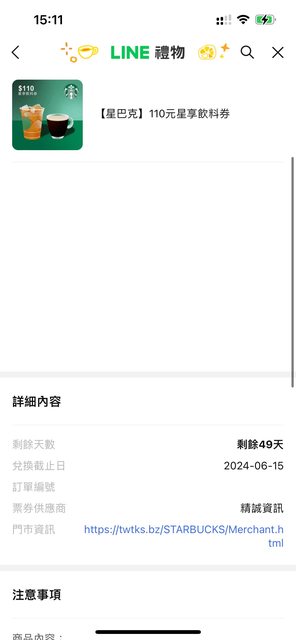 出售物:星巴克 星享飲料券 110元*32