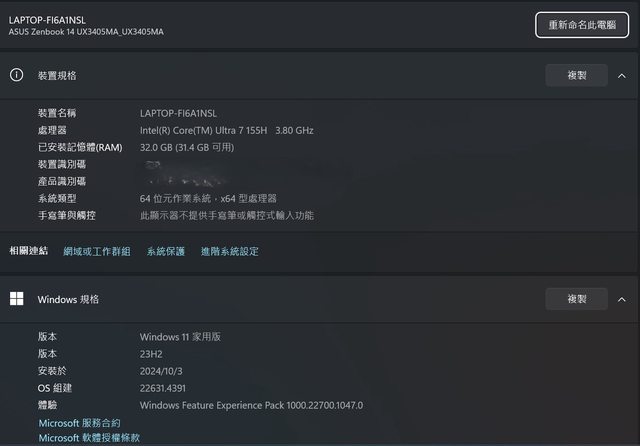 ◎筆電型號: ASUS Zenbook 14 OLED UX3405MA-0142B155H (1.2公斤、薄14.9公釐)