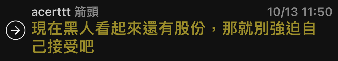 → acerttt : 現在黑人看起來還有股份,那就別強迫自己接受吧 10/13 11:50