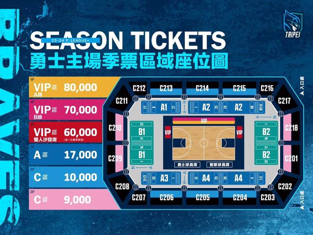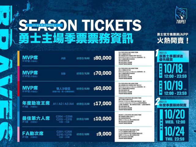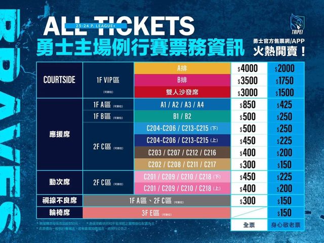 本季各大票種可至「臺北富邦勇士官方售票網&APP」訂購季票及預售票