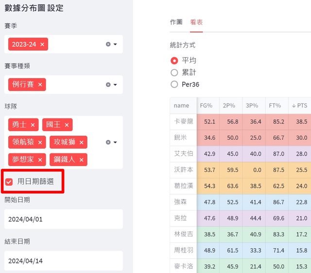 原本是顯示整季數據,我在左側欄加了一個勾選項,勾選後可以選擇日期區間(下圖就是只看四月數據)