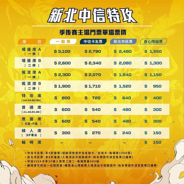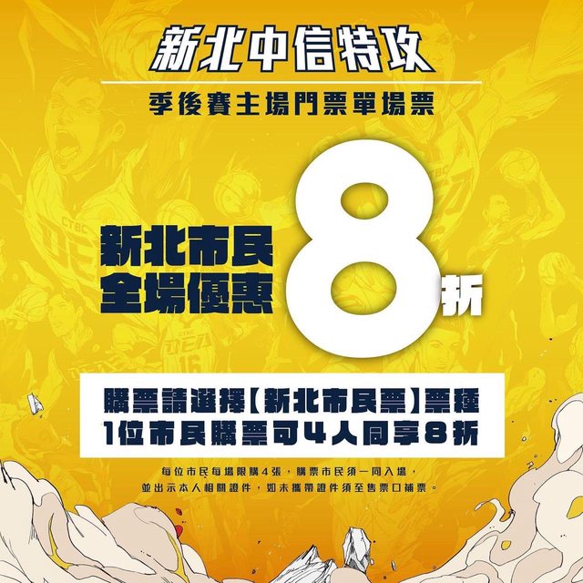 本季季後賽首度推行「 #新北市民全場8折」,並加碼 #1位市民購票可4人同享8折 的福