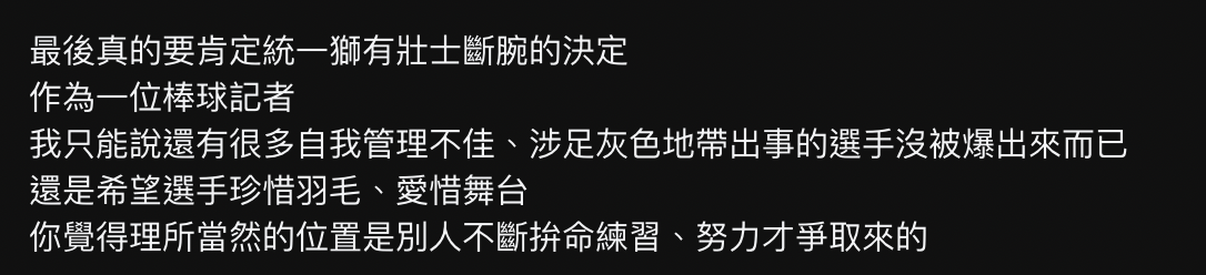 → jeangodard : 中職就是被黑怕了 這條路也走了三十年才比較有章 05/17 13:14