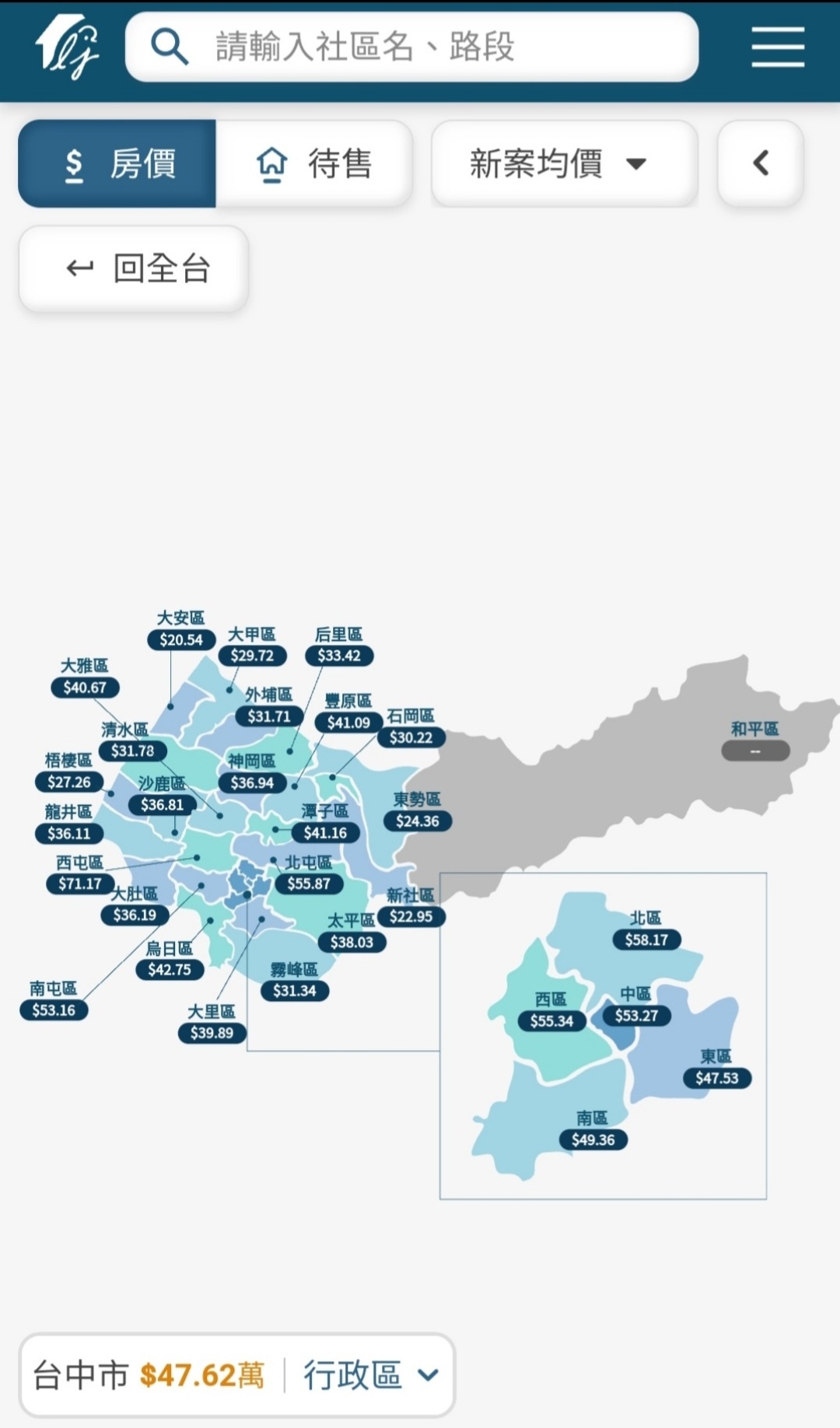 推 Bennyhome: 台中跟高雄哪裡只差2萬,看樂居區域房價,台中新案均 11/16 15:09