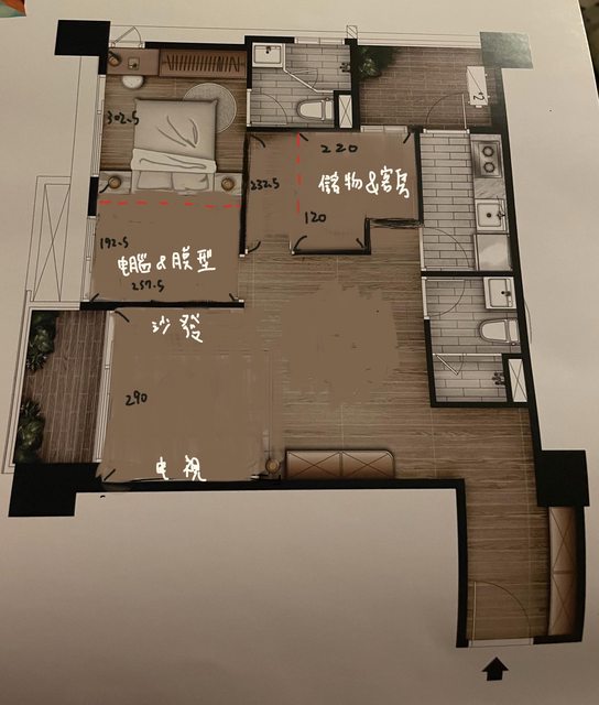 目前預計為1-2人住不考慮小孩,主臥想設計一區為電腦與模型放置處,一區為床與衣櫃,