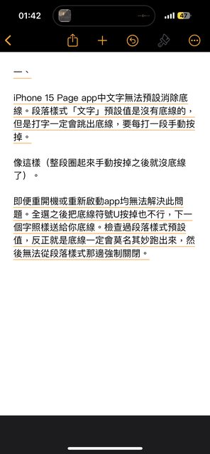 iPhone 15 Page app中文字無法預設消除底線。段落樣式「文字」預設值是沒有底線的,但