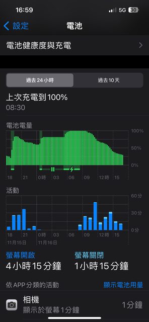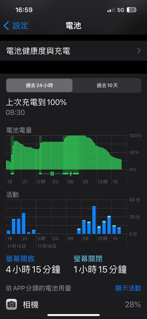 圖片上 最底下的相機功能,只顯示使用一分鐘,但是耗電量卻是28%