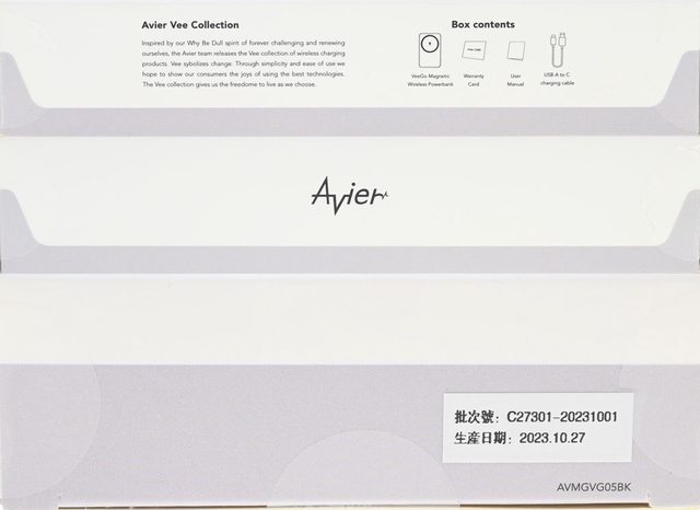 ▼外盒左側面有Avier Vee系列簡介及包裝內容,外盒右側面有商標,外盒下側面有批次/
