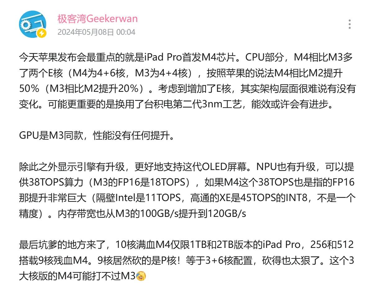 噓 mygogocow: 256和512的iPad Pro是「3」大核,1TB才有4大核 05/09 11:15