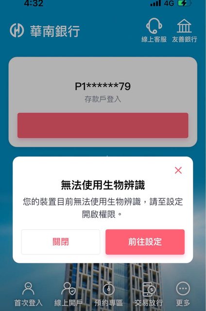 舉華南銀行例子圖二三,打開app寫無法使用生物辨識,