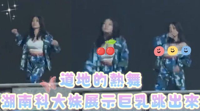 近日湖南某科技大學一名女大生,穿著迷彩服搭配白色馬甲中空裝,在台上奮力扭腰擺臀 的熱舞影片在網上流傳,只見這名妹子一個跳躍下來後,左半球竟整顆彈出來,衣服完全 包覆不住,讓台下學生一片驚呼全看傻眼。 https://i.imgur.com/OadE1BW.jpg