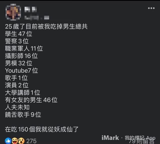 ▲女網友原文如上。(圖/翻攝爆廢1公社) 這篇PO文被網友轉貼到臉書社團「爆廢1公社」,感嘆「民風敗壞啊」,吸引7400多名網 友按讚留言,「放心,再吃下去妳就升天了」、「會不會成仙不好說,一些有的沒的應該 會先安裝完畢」、「會不會是倩女幽魂裡的黑山老妖」、「真可怕,吃這麼多人,真是食 人魔」、「只有我看到重點嗎?有女友的男生46個」、「人人都會有幻想的事情,但是我 勸妳還是快點從夢裡醒來吧」。 也有人說,「說真的男生能玩女生也能玩吧」、「如此敗壞社會風氣!可惡至極!為了匡 扶漢室,請給我聯絡方式」、「妳還有時間算...那也沒什麼了不起的」、「當你在解鎖成 就的同時,對方也在解鎖成就」。 https://www.ettoday.net/news/20231208/2639622.htm?from=ettoday_app -- ※ 發信站: 批踢踢實業坊(pttbestweb.org.tw), 來自: 49.216.191.98 (臺灣) ※ 文章網址: https://pttbestweb.org.tw/sex/M.1702208298.A.E9F
