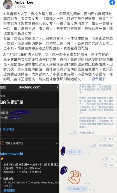 ▲女網友公開訂房及雙方對話紀錄。(圖/翻攝自Facebook/RJ 廉傑克曼) 至於被指「暈船不成才爆料」,Amber嘲諷「我不會暈有女友然後技術差的男生」,強調 已經明顯是要和阿傑劃清界限,「但對方說一些不著邊際的話,最後在怪罪於我傳的訊息 給他壓力,我只是認真要釐清關係,大家都大人了不要浪費時間」。 此外,網友批評Amber「性器官羞辱」,她也道歉表示絕非本意,「事實上尺寸這件事是 非常主觀的,我主觀的認定8公分很小在抱怨,是因為數據統計的平均尺寸是12~13,所以 主觀認定8公分很小,並沒有針對這部分做污辱」,坦言沒想到會受到如此大的關注。 https://www.facebook.com/amber.kameko/posts/2074489986231774?ref=embed_post https://i.imgur.com/pv6cj93.png
