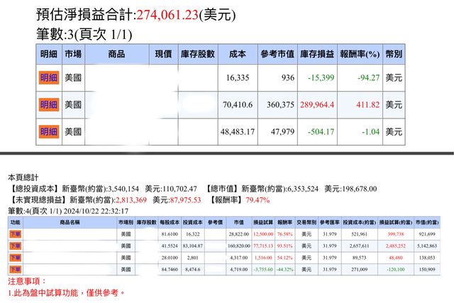 今年股票年初至今未實現損益約1200W