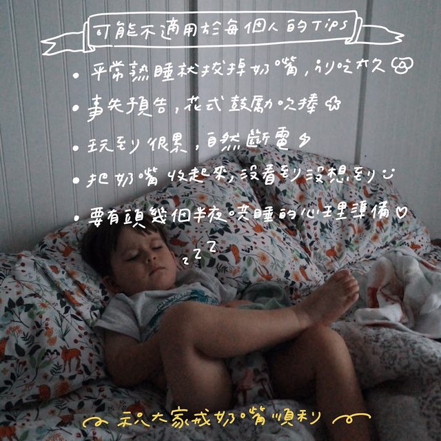 再來我兒子是除了旅行途中以外,只有午睡跟晚上睡前要吃奶嘴,那熟睡就可以拔掉,別