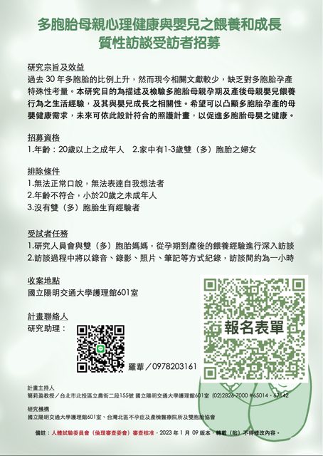 多胞胎母親心理健康與嬰兒之餵養和成長訪談 受試者招募