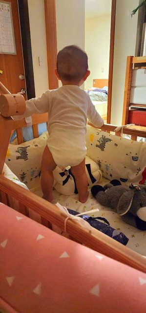 → strawmei : 會扶站一定要改能降床板的嬰兒床才安全,不然真的 12/03 07:20