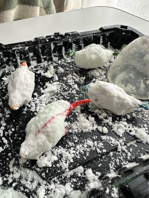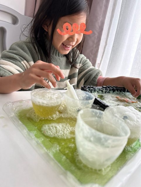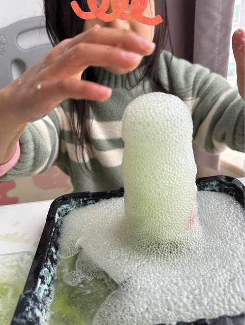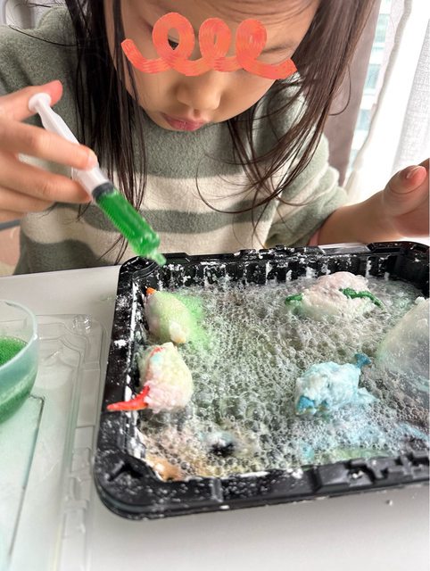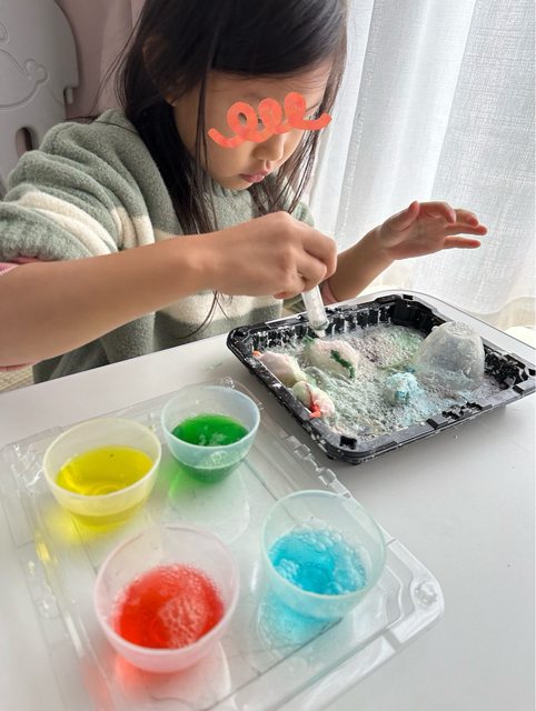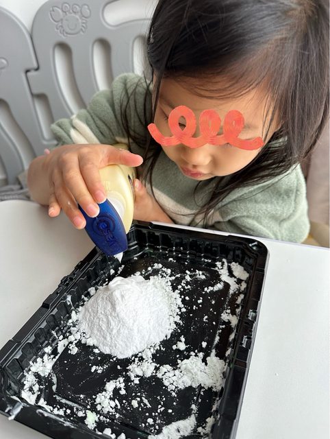 4.針筒吸取檸檬酸淋在小蘇打粉的人造雪上