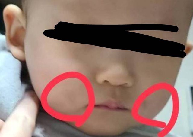 下班去接寶寶的時候發現左右臉頰嘴角旁各有一個小瘀青,直徑大概1cm,顏色紅紅的,當