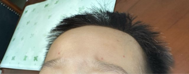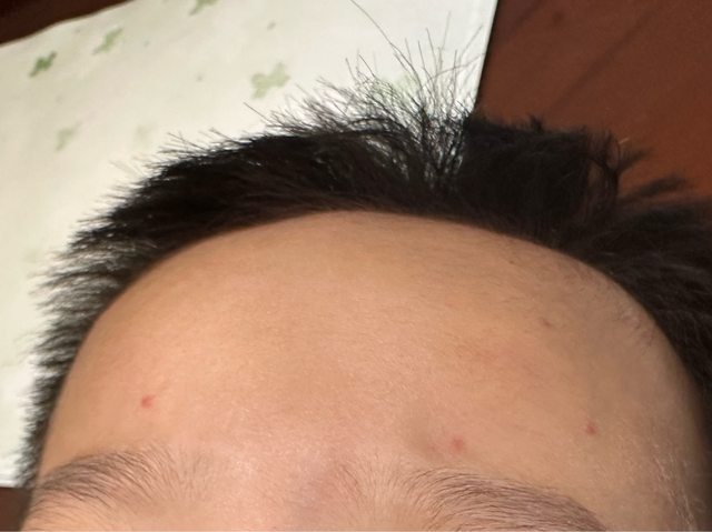 想請問大家小孩目前2y4m,今天從托嬰回來後發現額頭有幾顆凸凸的紅疹,問他痛或癢也