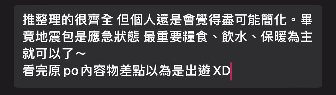 背包裡常備一顆行動電源,每次發生比較大的地震後我就會去拿出來重新充電,以免久放後電力耗損快。