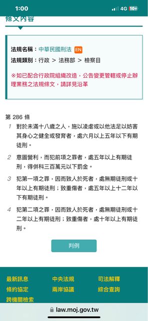 → snowtoya : 、病不使醫,傷不使療 都算是凌虐,輕傷5年,重傷 04/10 11:17