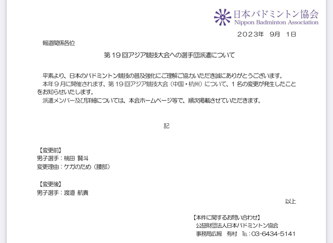 → Barbie1353 : 因為桃田腰傷,日本亞運團賽成員換成阿貴 09/01 18:36