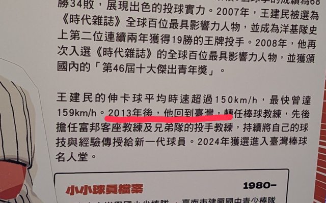 這幾天也有稍微去看一下 我們台灣之光、台南之子、12強金牌教練 王建民的簡介錯得離譜 被寫成“2013回台灣當教練” 明明2016靠著不斷的努力 有回到大聯盟... 也有“後勁”紀錄片作為紀錄 為了回到大聯盟接觸了德州棒球農場 我相信也是成為好教練的養分 這麼重要的生涯轉捩點都可以去脈絡 台灣目前前五指標的棒球傳奇 維基百科上簡單就可以查到的東西都可以寫錯 這個展有用心在辦嗎...