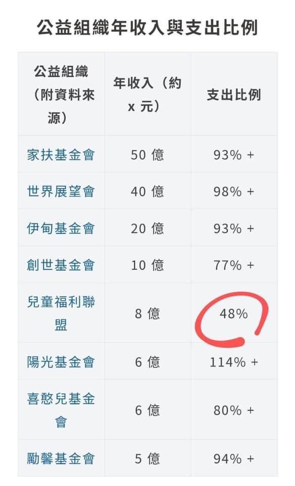 兒福盟居然都只有支出不到50%的收入