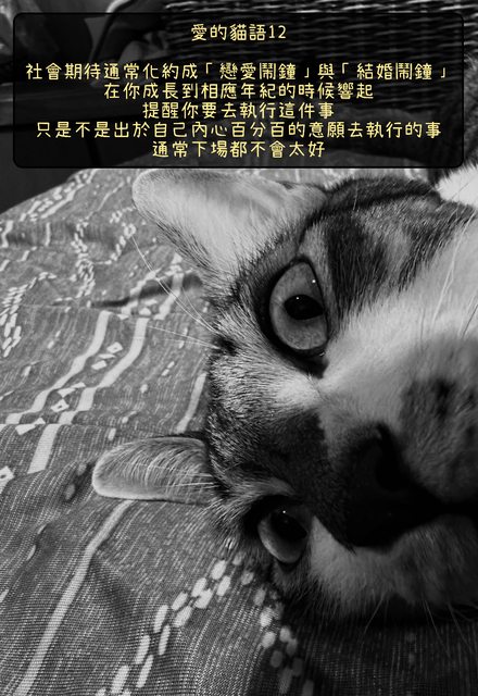 社會期待通常化約成「戀愛鬧鐘」與「結婚鬧鐘」,在你成長到相應年紀的時候響起,提醒你要去執行這件事。只是不是出於自己內心百分百的意願去執行的事,通常下場都不會太好。