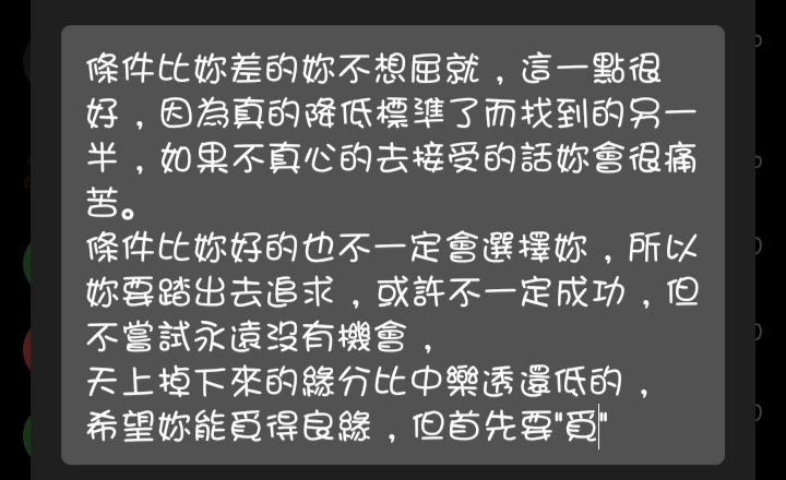 → sunshine901 : 「找不到對象後,會開始催眠自己一個人也很好」又一 02/04 23:51