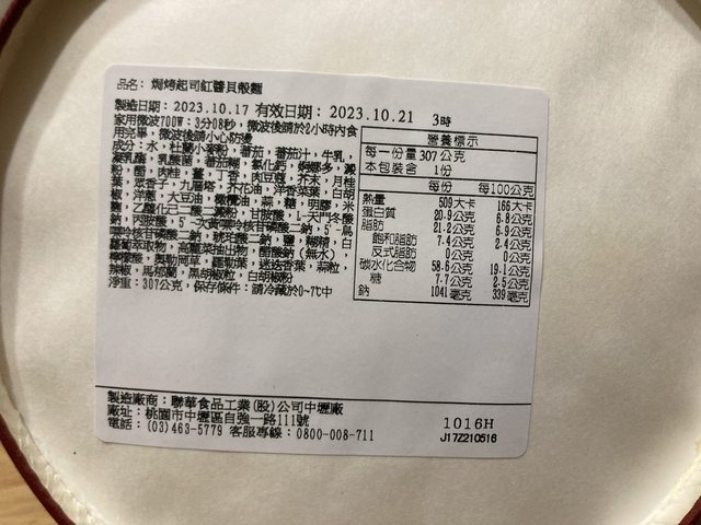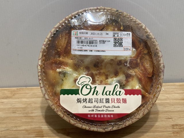 焗烤起司紅醬貝殼麵:307公克/水.小麥粉.番茄.羅勒./509大卡