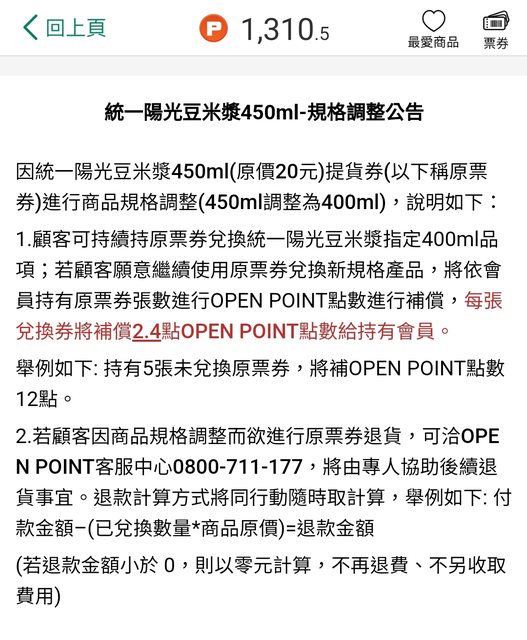 換新規格產品,將依會員持有原票券張數進行OPEN POINT點數進行補償,每張兌換券將補償